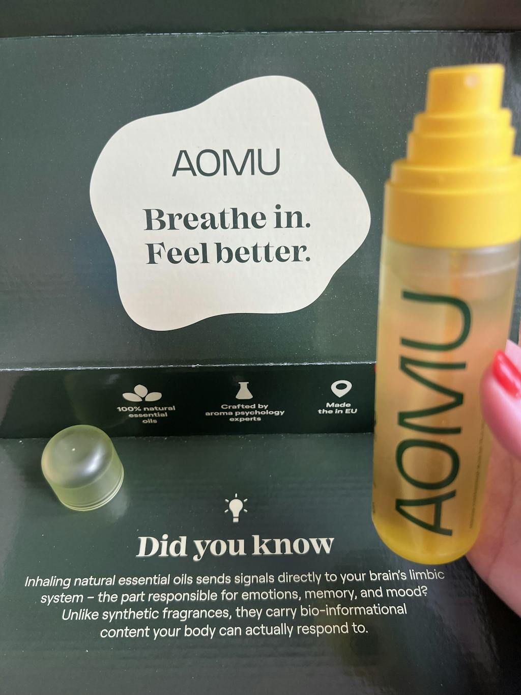Oceňuji nádobku vzhledem k jejímu rozměru se skvěle vejde do ledvinky, nebo do auta. Aplikace svěží citrusové vůně s oleji je výbornou metodou jak uvolnit napětí v hlavě při stresu nebo únavě. Člověk musím mít zavřené oči, aby nedošlo k pocitu pálení v místě oka. Menší nevýhodou mlhy může být lehký povlak který zůstává na pokožce po zaschnutí.